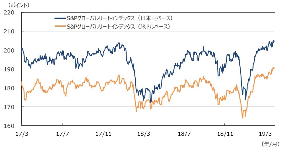 3月のグローバルリート市場(米ドルベース)は、米欧など主要国の長期金利が低下したことなどから、相対的な分配金利回りの高さに着目したリートが買われて上昇し、前月比+2.42%となりました。一方、円ベースの月間変化率は、為替効果がマイナス寄与となったため、同+1.84%となりました。