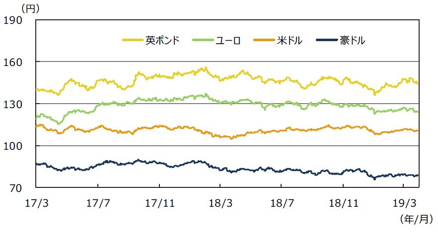 ユーロは、ユーロ圏のさらなる景気下振れ懸念が意識されやすくなると見られることや、英国の欧州連合離脱問題を巡る混乱の収束が依然見通せないことが不透明要因です。ECBも緩和的な政策を続けると見られることから、対円で125円を中心としたレンジ内の推移が続くと予想されます。