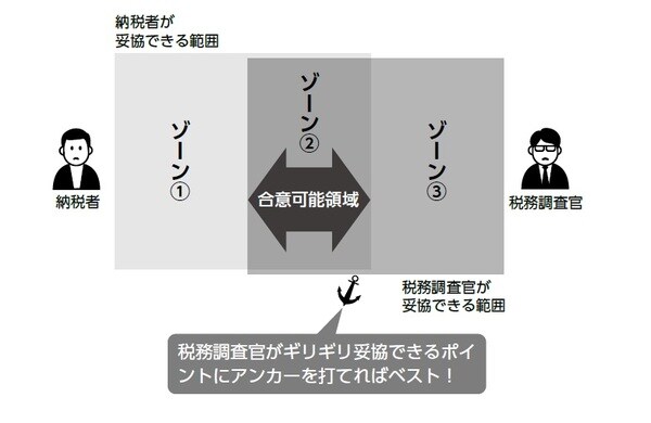 問題は、「アンカーをどこに打つのか」です。納税者と税務調査官の合意可能領域(ゾーン②)のうち、税務調査官側の端っこに打つのがベストでしょう。「ギリギリOK」にアンカーを打つことができれば、納税者にとっては一番よい結果になります。