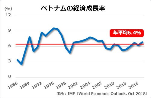 外資系企業の進出が相次ぐとともに、その成長の足取りがより力強くなっていったなか、アジア通貨危機やリーマンショックといった国際的な経済危機の影響も最小限に抑えながら、ドイモイ政策の導入から30年間におけるベトナム経済の成長率は、年平均6.4%という非常に高い水準を記録しています。