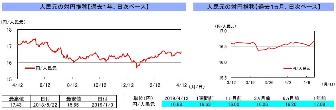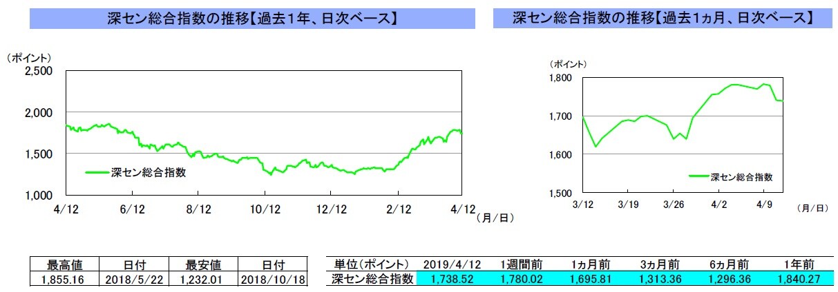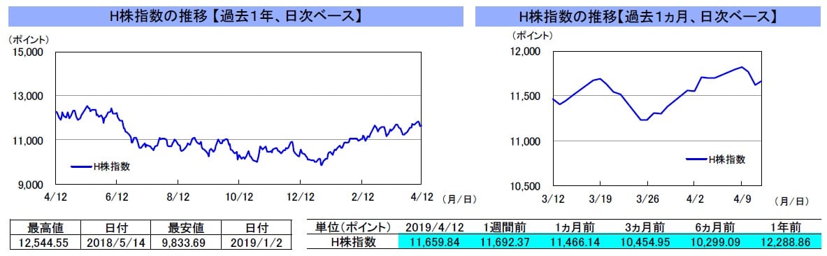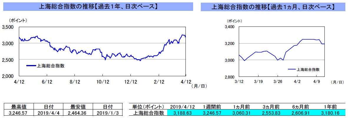 先週の中国本土市場は、上海総合指数が前週末比▲1.8%、深セン総合指数は▲2.3%と下落しました。前週まで上昇傾向となってきたなかで、株価は高値警戒感から利益確定の売りに押されました。週末に発表された中国の3月の貿易統計は輸出が市場予想を上回ったのに対し、輸入は市場予想を下回る結果となり、株価は小幅に反発しましたが、週間では株価は下落しました。香港市場は、H株指数が前週末比▲0.3%、レッドチップ指数は▲1.0%と下落しました。前週末に発表された米国の3月の雇用統計で雇用者数が市場予想を上回る堅調な結果となり、週初は株価が反発して始まりました。しかしその後は、週央に発表された国際通貨基金(IMF)の世界経済見通しが下方修正されたこともあり、これまで上昇傾向が続いてきた株価は利益確定の売りに押され下落しました。