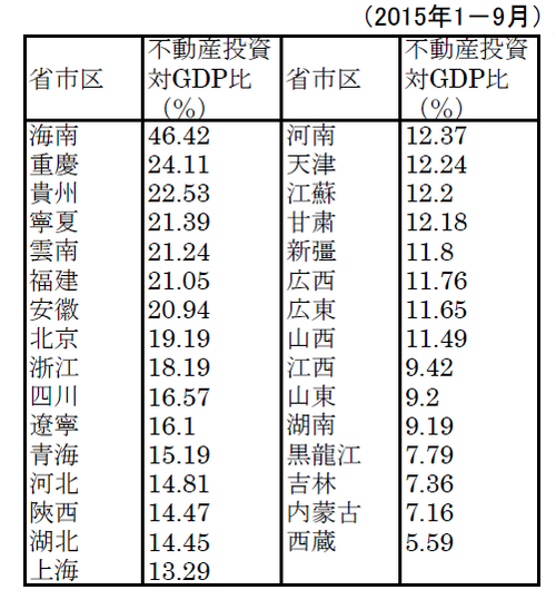 同協会によると、不動産投資の固定資産投資全体、またGDPに対する「合理的な基準」は各々、比率25%、10%以内、昨年1-9月、31省市区のうち、固定資産投資に対する割合が25%を超えた省市区は7、またGDPに対する割合が10%を超えた省市区は24に及ぶ(2015年11月16日付中国房地産網、図表2)。