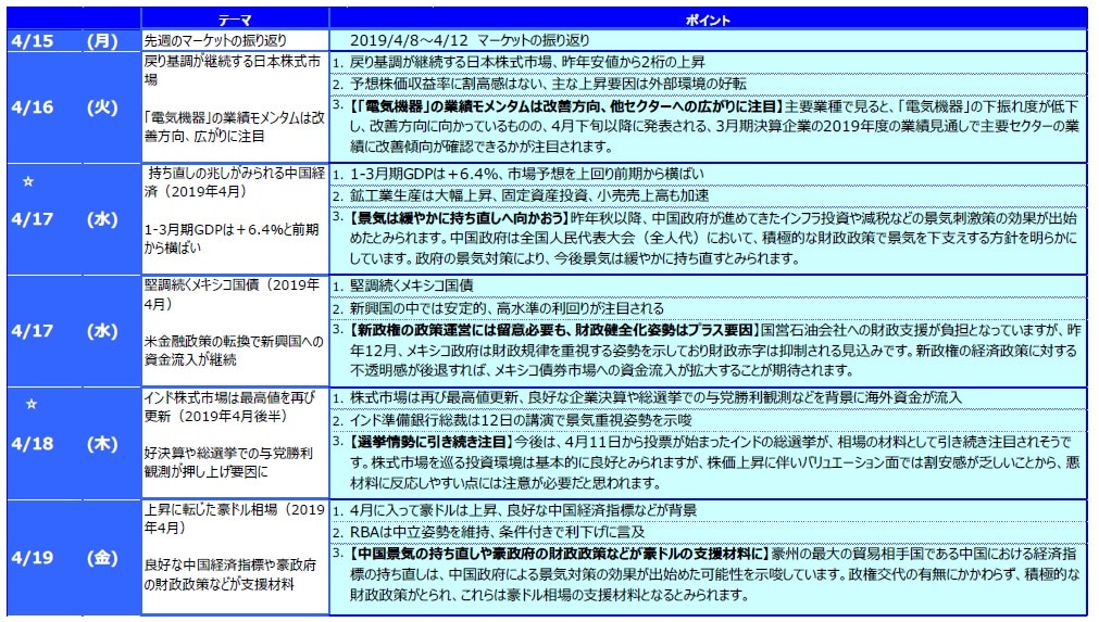 三井住友DSアセットマネジメント株式会社が、2019年4月15日~4月19日のマーケットについて振り返り、「1. 先週の市場動向、2. 先週のアジア・オセアニア株式・リート市場、3. 先週のマーケット・デイリー/ウィークリー、4. 今週の主な注目材料」のそれぞれについて解説します。今回は、「3. 先週のマーケット・デイリー/ウィークリー」を見ていきましょう。※本連載は、三井住友DSアセットマネジメント株式会社が提供するマーケットレポートを転載したものです。