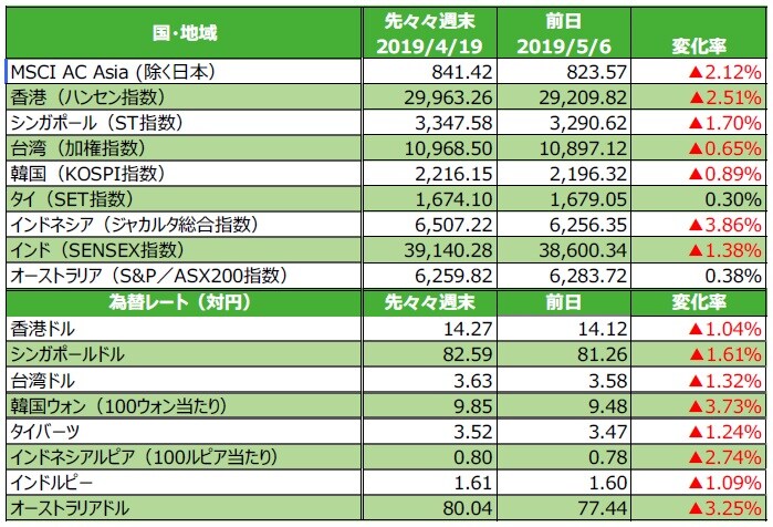 三井住友DSアセットマネジメント株式会社が、2019年4月22日~5月6日のマーケットについて振り返り、「1. 先週の市場動向、2. 先週のアジア・オセアニア株式・リート市場、3. 先週のマーケット・デイリー/ウィークリー、4. 今週の主な注目材料」のそれぞれについて解説します。今回は、「2. 先週のアジア・オセアニア株式・リート市場」を見ていきましょう。※本連載は、三井住友DSアセットマネジメント株式会社が提供するマーケットレポートを転載したものです。