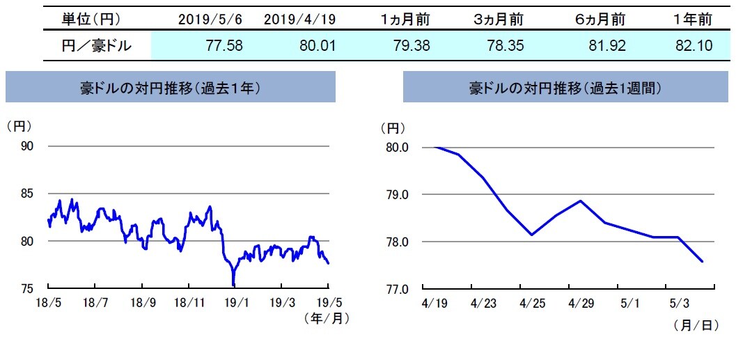 4月22日~5月6日の豪ドルの対円レートは、下落しました。4月24日に発表された豪州の2019年1-3月期の消費者物価指数が低水準となり利下げ期待が高まったことや、5月5日にトランプ米大統領が中国への追加関税を25%へ引き上げると表明し、米中貿易協議の先行きが不透明となったことなどから、豪州の対円レートは下落しました。