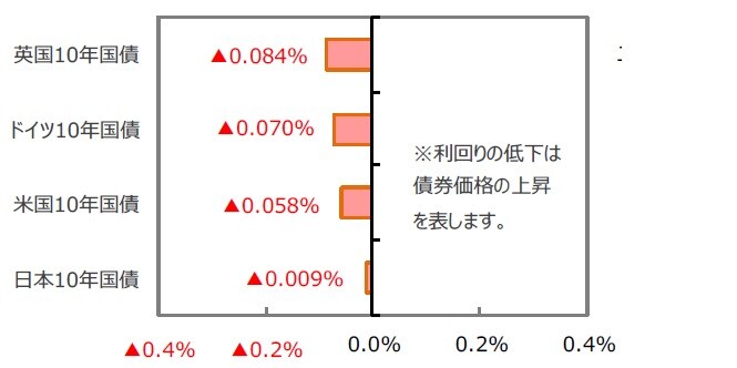 米国の10年国債利回りは、米中貿易摩擦激化による景気減速懸念や世界的な株安などを受けて、0.058%低下しました。ドイツ、英国、日本の10年国債利回りも低下しました。
