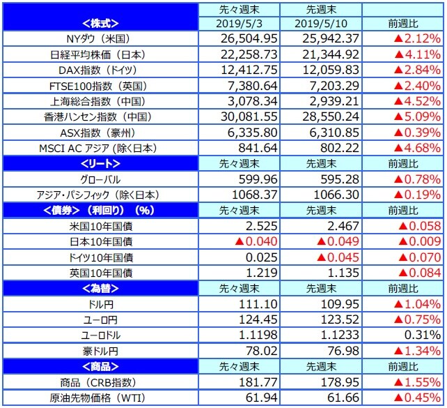 主要国の株式市場は下落しました。米国株式市場は、トランプ大統領が前週末、中国からの2,000億ドル相当の輸入品に対する追加関税を現在の10%から25%に引き上げると表明し下落して始まり、9日から開催された米中通商協議でも合意に至らずNYダウは週間では2.12%下落しました。日本株式市場は、米中貿易摩擦激化懸念による米国株安や円高などを嫌気して下落しました。国内企業の決算見通しが慎重であったことも下落を大きくしました。日経平均株価は4.11%下落しました。欧州株式市場は、米中貿易摩擦激化懸念などからドイツDAX指数が2.84%、英FTSE100指数は2.40%下落しました。中国株式市場も米国の追加関税の引き上げ表明や米中通商協議で合意に至らなかったことなどを受けて、上海総合指数は4.52%、香港ハンセン指数は5.09%下落しました。