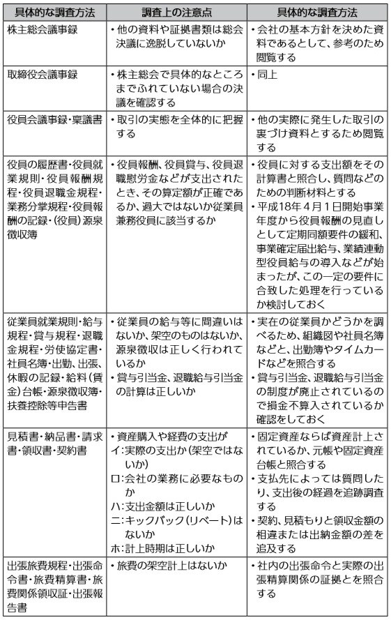 その他、確認すべき契約書・書類、また証拠資料と具体的調査手法については、一覧表[図表2]を確認してください。特に問題になりやすいのは、一覧表で太字にしています。