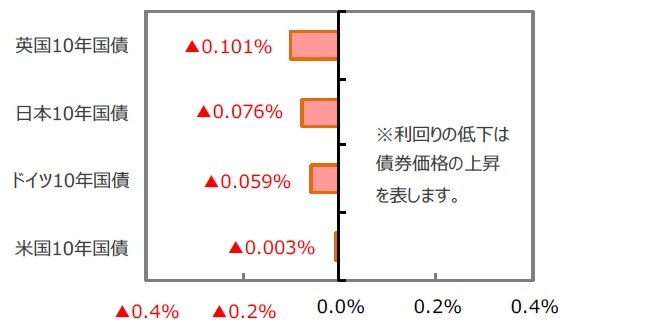 米国の10年国債利回りは、米中貿易摩擦激化による景気減速懸念などを背景に、0.076%低下しました。ドイツ、英国、日本の10年国債利回りも低下しました。