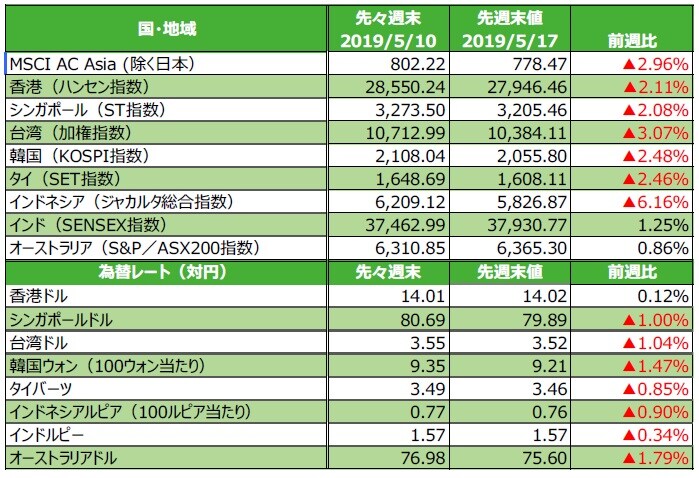 三井住友DSアセットマネジメント株式会社が、2019年5月13日~5月17日のマーケットについて振り返り、「1. 先週の市場動向、2. 先週のアジア・オセアニア株式・リート市場、3. 先週のマーケット・デイリー/ウィークリー、4. 今週の主な注目材料」のそれぞれについて解説します。今回は、「2. 先週のアジア・オセアニア株式・リート市場」を見ていきましょう。※本連載は、三井住友DSアセットマネジメント株式会社が提供するマーケットレポートを転載したものです。