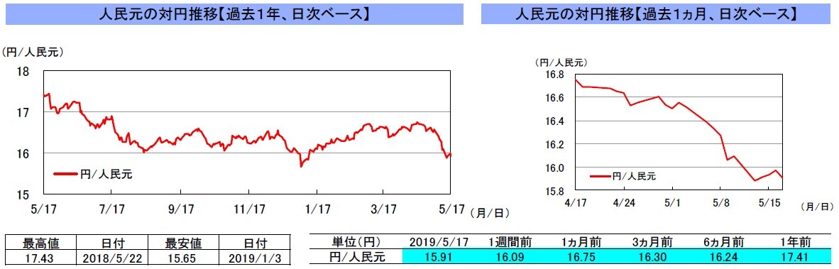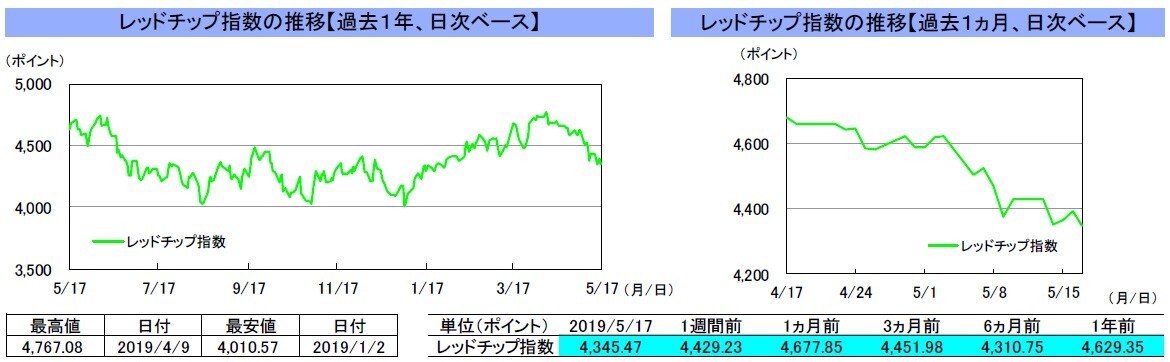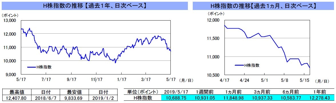 先週の中国本土市場は、上海総合指数が前週末比▲1.9%、深セン総合指数が▲2.3%と下落しました。週初は、米中が双方に追加関税の強化を決めたことを背景に、下落して始まりました。週半ばには、米中協議進展への期待が高まったことなどから、上昇に転じる場面もありましたが、その後、米国が中国の通信機器大手に対して事実上、米国企業との取引を禁止する措置を発動したほか、人民元の先安観の強まりを受けて資金流出が意識されたことから、週間では株価は下落しました。香港市場は、H株指数が前週末比▲2.2%、レッドチップ指数が▲1.9%と下落しました。米国が中国の通信機器大手に対して制裁措置を発動したことなどが嫌気され、株価は下落しました。