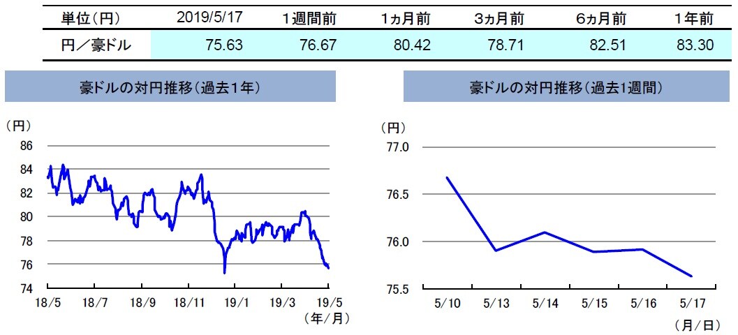 先週の豪ドルの対円レートは、下落しました。先週は、米中が互いに追加関税の強化を決めたことで世界的にリスク回避の動きが進んだほか、16日に発表された4月雇用統計で失業率が5.1%から5.2%へ上昇し、豪州準備銀行(RBA)が早ければ6月にも利下げに踏み切るとの観測が高まったことなどから、豪ドルの対円レートは下落しました。
