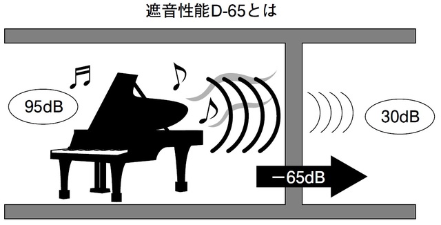 少し専門的な話になりますが、現在ミュージションは、D-65というレベルの遮音性能を目指しています。遮音性能とは、隣室から室内へ侵入する音、漏れる音をどれくらい遮ることができるかということです。