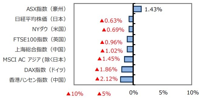 主要国の株式市場は概ね下落しました。米国株式市場は、米国が中国の通信機器大手との取引規制に加え、ビデオ監視装置企業にも同様の制限を検討との報道があり、米中の貿易交渉が行き詰まるとの懸念を受けて、NYダウは週間では0.69%下落しました。日本株式市場は、1-3月期のGDPが市場予想を大きく上回りましたが影響は限定的で、むしろ米中貿易摩擦激化懸念などを嫌気して、日経平均株価は0.63%下落しました。欧州株式市場は、米中の貿易交渉が行き詰まることへの懸念や英国のEU離脱を巡る不安などが嫌気され下落しました。中国株式市場は、米中の貿易摩擦激化懸念などから上海総合指数は1.02%、香港ハンセン指数は2.12%下落しました。豪州株式市場は、総選挙での与党勝利や中銀の利下げ期待の高まりを受けて上昇しました。