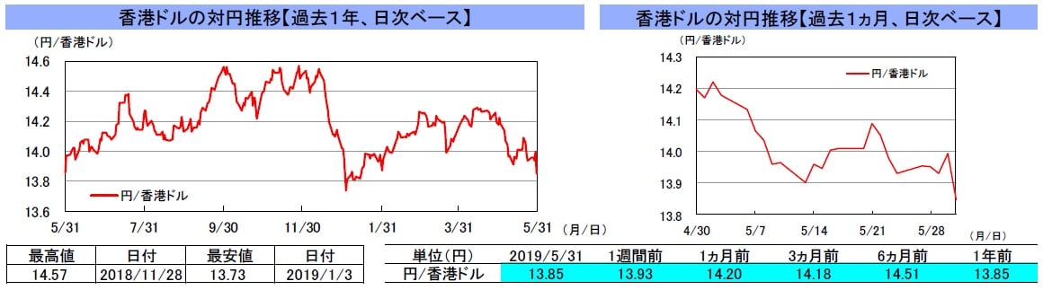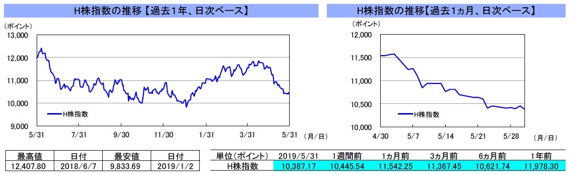 先週の中国本土市場は、上海総合指数が前週末比+1.6%、深セン総合指数が+2.4%と上昇しました。代表的な株価指数における中国株の組み入れ比率の拡大が5月28日に実施されたことを背景に、海外資金の流入を期待した買いが入ったほか、中国人民銀行が連日、公開市場操作(オペ)で資金供給を行ったことなどが好感され、株価は上昇しました。香港市場は、H株指数が前週末比▲0.6%と下落した一方、レッドチップ指数は+0.3%と上昇しました。米中貿易摩擦をめぐる先行き不透明感が意識されたことなどから、H株指数は下落しました。レッドチップ指数は、H株指数と同様の市場環境の中、小幅ながら上昇しました。