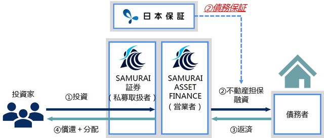 具体的には、SAMURAI ASSET FINANCEが有する貸付債権に対して、返済遅延や返済不能などが発生した場合は、日本保証がそれを肩代わりするという仕組みだ。