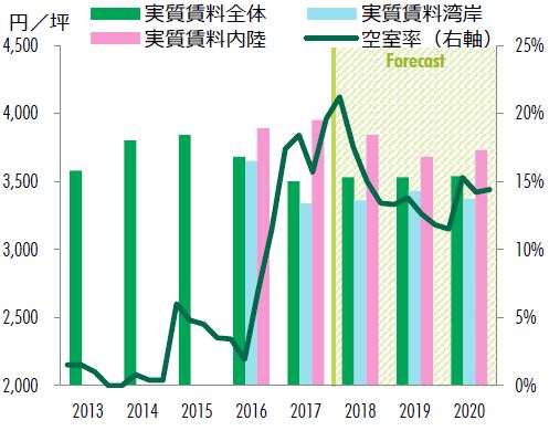 東京ベイエリアでは、2018年Q3に1年ぶりの新規供給があったが、当該物件は2017年末時点で既に満室稼働となっていた。このエリアの既存物件で退去テナントが出た際には、後継テナントが短期間で決まっている上、より高い賃料で契約しており、需要の強さを示している。2020年末までの今後2年間で3棟竣工予定であるが、複数物件で一部の床が既に決まりつつある。実質賃料は2018年Q4時点で対前年同期比+2.4%の6,740円/坪の見込み。2020年末時点の賃料は、対2018年末比で1.3%の上昇を予想している。