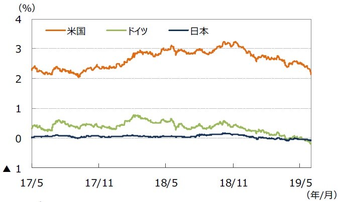 米国では、10年国債利回りが低下しました。米国の対中追加関税引上げ表明をきっかけに米中貿易摩擦が再燃したことからリスク回避の動きが強まりました。個人消費(PCE)コア物価の伸び率が下方修正されるなど物価上昇圧力が鈍いことや、月末にはトランプ大統領が、不法移民対策が不十分であるとしてメキシコに対し追加関税を課すと表明したことなどから下げ幅を広げ、月末には2.12%と約1年8カ月ぶりの低水準となりました。