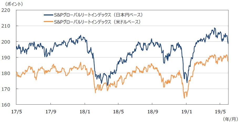 グローバルリート市場(米ドルベース)は、貿易摩擦激化の懸念によるリスク回避ムードの高まりを受けて下落しました。ただし、主要国の長期金利が低下したことがリート市場の下支えとなったほか、リートのディフェンシブ性が評価され、下落幅は前月比で▲0.52%にとどまりました。一方、円ベースの月間変化率では、安全通貨とされる円が買われたため為替はマイナスに寄与し、同▲3.02%となりました。