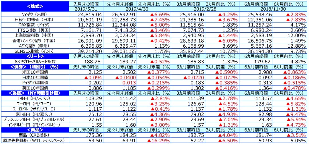 米国の株式市場は、米政府の対中追加関税引上げや、トランプ大統領のメキシコに対する関税引上げ表明など、貿易摩擦激化への懸念から大幅に下落しました。欧州の株式市場は、英国の欧州連合(EU)離脱が混迷を深めていることや、貿易摩擦激化への懸念等から大幅に下落しました。日本の株式市場は、貿易摩擦激化を背景とした世界経済減速懸念からリスク回避の動きが強まり、円高が進行したことから、大幅に下落しました。