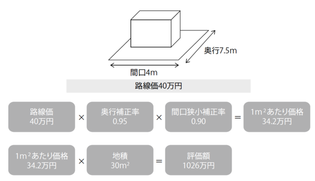 路線価40万円×奥行補正率0.95×間口狭小補正率0.07=36.86万円/㎡