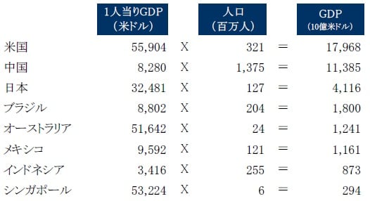 が少ないことから経済大国にはなれません。米国の人口の10分の1以下のオーストラリアは、1人当たりで米国人の10倍以上稼いでやっとGDPで並ぶことができるのです。