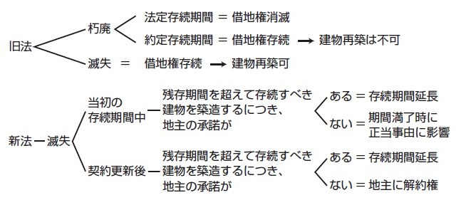 他方で、新法では、「朽廃」による借地権消滅の制度を採用しませんでした。ただし、借地権の存続期間が満了した時点において、建物の存在を更新請求と法定更新の要件としています(新法5条1項2項)。建物が存在しない場合には、原則として更新はされませんので、借地人は要注意です(この場合、合意更新するほかありません。ただし、地主の妨害によって建物滅失後再築ができなかった場合には、建物不存在を理由に借地権者の更新請求権を否定することは信義則上許されないとした裁判例があります(最判昭和52・3・15判時852号60頁))。