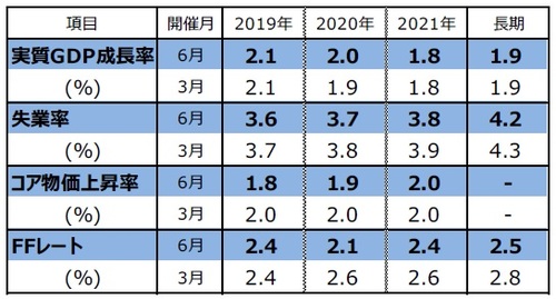 (注2)FOMC参加者による予測の中央値。実質GDP成長率とコア物価上昇率は10-12月期の前年同期比。コア物価上昇率は個人消費支出(PCE)コア物価指数。失業率は各年10-12月期の平均値。FFレートは各年末時点における誘導レンジの中央値。