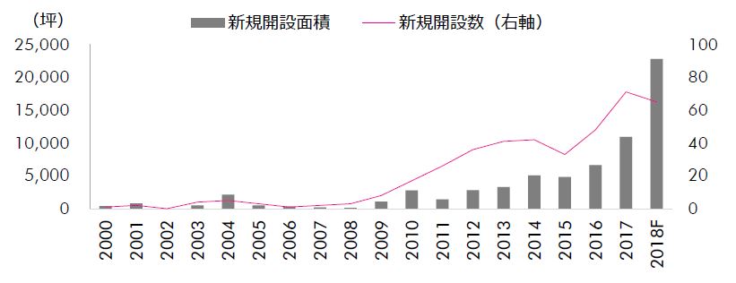 ストックとの比較で見ると未だ小さいコワーキングオフィスだが、フローとの比較で見ると存在感は急速に高まっている。2010年以降、コワーキングオフィスの開設数は増加基調にあり、特に2017・2018年に市場規模は急拡大した(図表4)。2000~2016年の17年間に開設された面積(合計3.3万坪)を、わずか2年間で超えた。