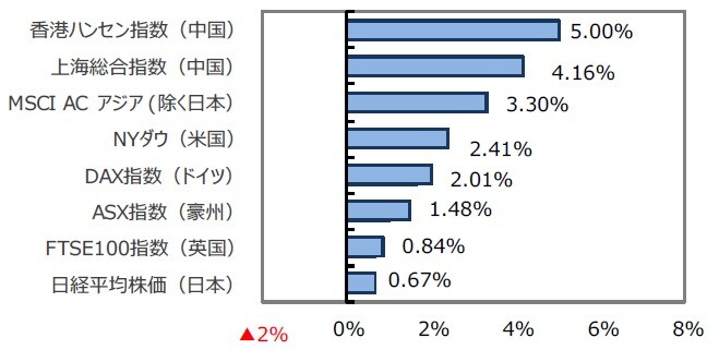 主要国の株式市場は上昇しました。米国株式市場は、6月28、29日の主要20カ国・地域(G20)サミットで米中首脳会談が行われる見込みとなり、米中貿易交渉の進展期待が高まったことや、米連邦公開市場委員会(FOMC)で早期利下げ観測が強まったことなどを好感して、NYダウは上昇し、取引時間中に一時、終値での過去最高値を上回りました。NYダウは週間では2.41%上昇しました。日本株式市場は、米中貿易交渉の進展期待や米国株高などを好感して、日経平均株価は0.67%上昇しました。欧州株式市場は、米国株高や米中貿易交渉の進展期待の高まりなどを好感して上昇しました。中国株式市場は、米中貿易交渉の進展期待が高まったことや、米国で早期利下げ観測が強まったなどを好感して上海総合指数は、4.16%、香港ハンセン指数は5.00%上昇しました。