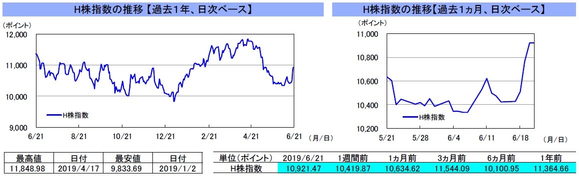 先週の中国本土市場は、上海総合指数が前週末比+4.2%、深セン総合指数が+4.8%と上昇しました。米連邦公開市場委員会(FOMC)で年内の利下げの可能性が示唆されたことや、ドラギ欧州準備銀行(ECB)総裁が追加緩和に前向きな姿勢を示したこと、米中首脳の電話会談によって米中首脳会談が実施されることとなったことなどが好感され、株価は上昇しました。香港市場は、H株指数が前週末比+4.8%、レッドチップ指数が+2.8%と上昇しました。欧米中銀のハト派姿勢や米中貿易協議の進展期待などを受けて、株価は上昇しました。