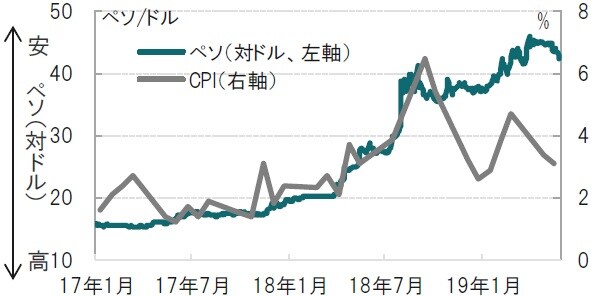 アルゼンチンはトルコと並んで新興国市場の不安定要因となっています。ペソは18年年初頃から消費者物価指数(CPI)の上昇に伴いペソ安が進行し、足元インフレ率の上昇ペースに若干減速が見られるも、ペソは依然不安定な動きとなっています(図表1参照)。成長率など経済指標の改善が鈍い上、選挙への懸念も考えられます。