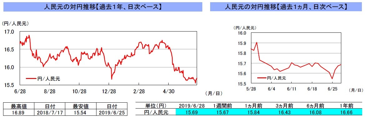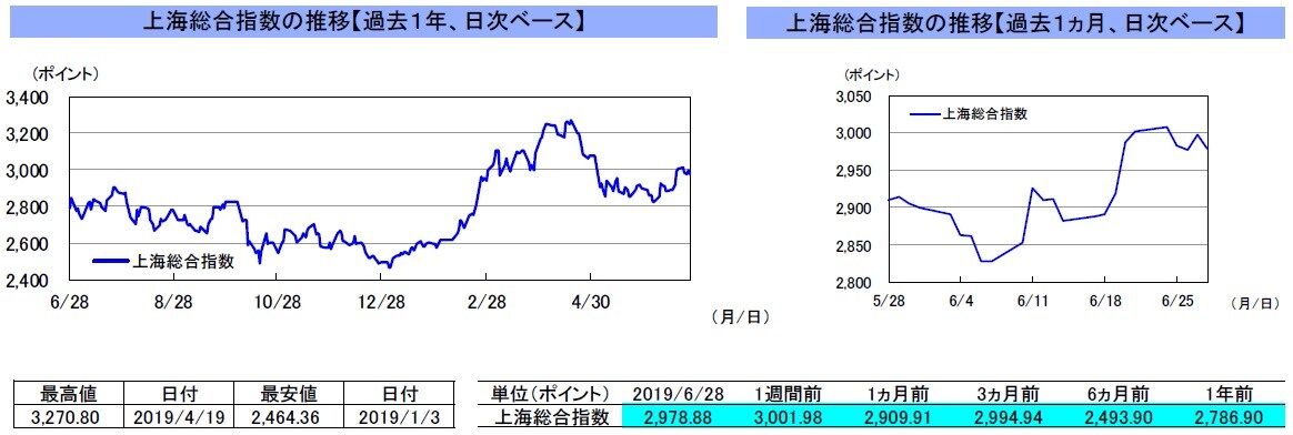 先週の中国本土市場は、上海総合指数が前週末比▲0.8%、深セン総合指数が▲1.0%と下落しました。足元の株価上昇を受けて利益確定の売りがみられたほか、週末に米中首脳会談などを控え、様子見ムードが強まったことなどから、株価は下落しました。香港市場は、H株指数が前週末比▲0.4%と下落した一方、レッドチップ指数が+0.7%と上昇しました。週末の米中首脳会談や7月1日の祝日などを控えた様子見姿勢の強まりなどから、H株指数は下落しました。レッドチップ指数は、H株指数と同様の市場環境の中、上昇しました。