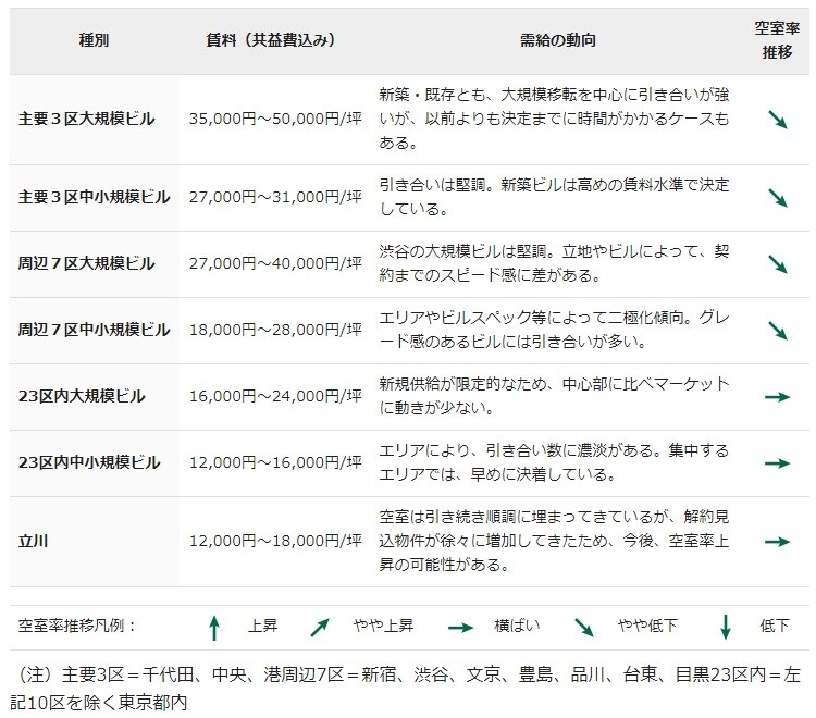 ![[図表1]2019年3月期 東京のオフィスマーケットの相場表 ※主要3区=千代田、中央、港周辺7区=新宿、渋谷、文京、豊島、品川、台東、目黒23区内=左記10区を除く東京都内 ※※物件検討時の予算の目安(出所: 『BZ空間』 2019年夏季号)](https://ggo.ismcdn.jp/mwimgs/c/a/640/img_ca73110f5f896a3a28f718a5aae1f95c164285.jpg)