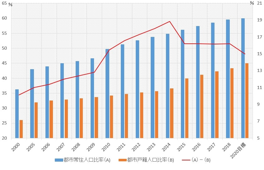 都市(城市、または周辺にある小都市、鎮を含め城鎮)化の推進は一貫して中国当局の重点政策となってきた。「国家新型城鎮化計画(2014~20年)」は20年までに都市常住人口比率(1年のうち延べ6ヵ月以上、都市に在住する者の対総人口比)を60%、都市戸籍人口比率(都市戸籍者の対総人口比)を45%にまで高める目標を掲げ、国務院は16年9月、都市戸籍人口比率の目標を達成するため、第13次5ヶ年計画期間(2016~20年)、1億人に都市戸籍を付与するとの方案を発出した。