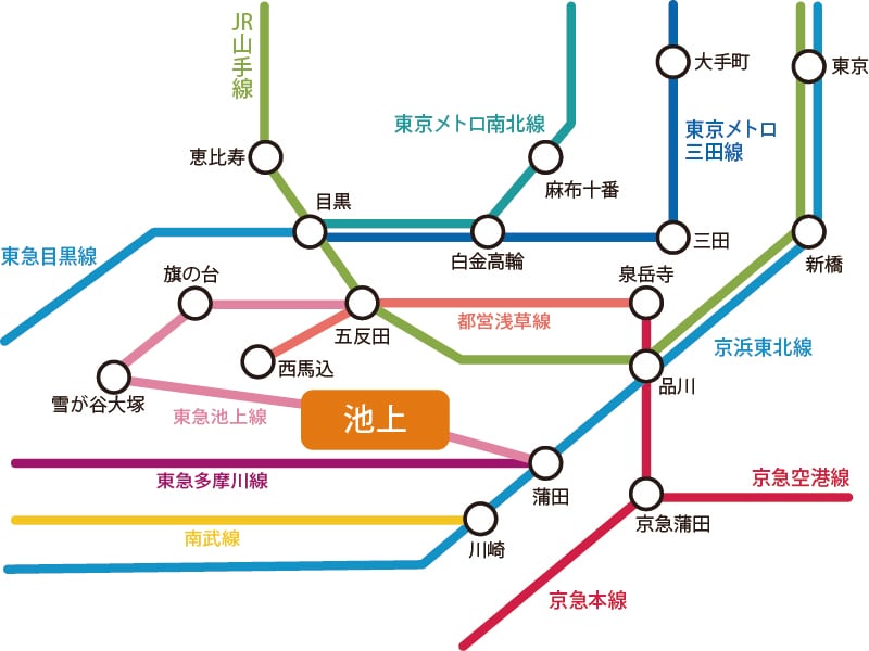「池上」駅は東急池上線が利用可能です。池上線はJR山手線「五反田」駅から、大田区の商業の中心地「蒲田」までを結ぶ路線です。「池上」駅は「蒲田」駅からは2駅約5分、「五反田」駅からは20分程度の場所にあります。