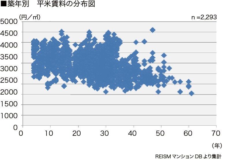※[図表2、3共通]リズムマンションDBより作成(データは2015年12月末日現在のデータです)※賃料単価は平均値であり、平米数を乗算した価格が必ずしも相場と一致するものではありません※重回帰分析は築10~30年、16㎡以上30㎡未満の物件から算出しています