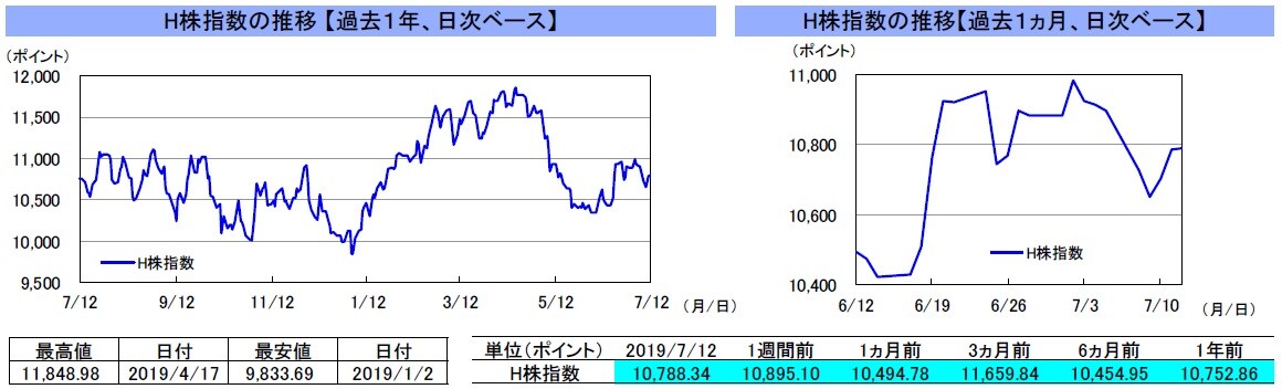 先週の中国本土市場は、上海総合指数が前週末比▲2.7%、深セン総合指数が▲2.8%と下落しました。4-6月期GDPなどの主要経済指標の発表を控えて様子見姿勢が強まったほか、ハイテクベンチャー向け市場「科創板」が22日に取引開始となるのを前に需給悪化懸念が意識されたことなどから、株価は下落しました。香港市場は、H株指数が前週末比▲1.0%、レッドチップ指数が▲1.4%と下落しました。5日に発表された6月の米雇用統計が市場予想を上回ったことによって米国の大幅利下げ観測が後退したことや、「科創板」の取引開始を控えた需給悪化懸念で本土株市場が下落したことが嫌気され、株価は下落しました。