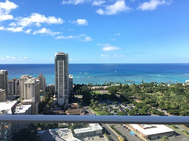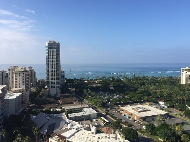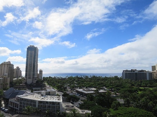 そして33階からの眺望ですが、水平線もはっきり見える程の圧倒的なオーシャンビューとなり、右手にあるヒルトン・ハワイアンビレッジや左にあるロイヤルハワイアンホテルの上空や隙間からも海が見え、まさに一面に海が広がるイメージです。