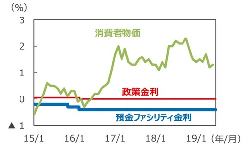■フォワードガイダンス(先行きの金融政策の指針)において、「少なくとも2020年前半まで政策金利は現状か、“より低い水準”を予想する」と明言し、利下げを示唆しました。加えて、18年12月に打ち切った量的緩和策の資産購入プログラム(QE)を再開する可能性についても触れました。