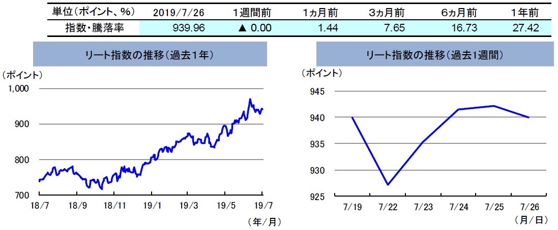 先週の豪州リート指数は、横ばいとなりました。先週は、豪州株式が上昇傾向で推移するなか、おおむね同様の展開となったものの、22日に豪州リート指数が豪州株式よりも大幅に下落したことから、週間では豪州リート指数は横ばいとなりました。