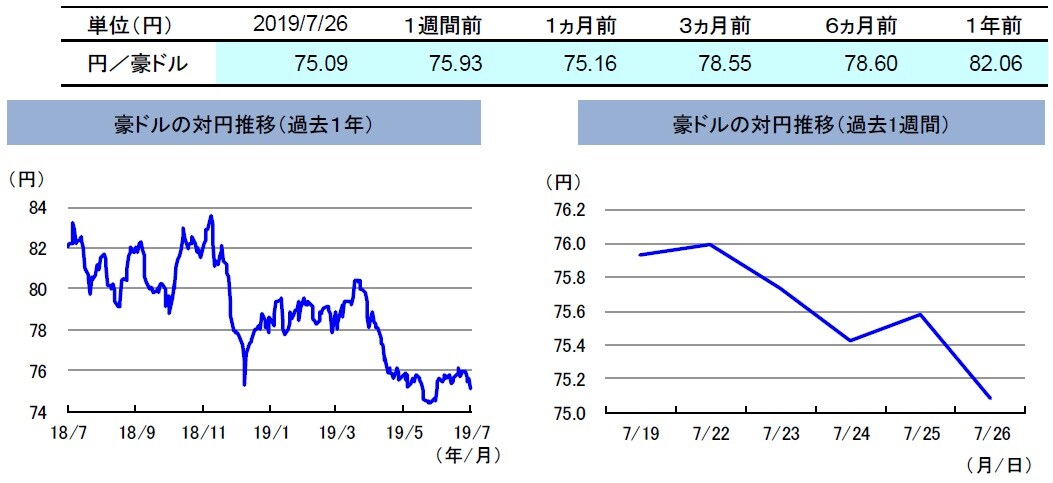 先週の豪ドルの対円レートは、下落しました。先週は、豪州準備銀行(RBA)のロウ総裁が講演で、必要があれば追加緩和に踏み切るとの姿勢を改めて示したほか、低金利が長期間続くと予想するのが妥当と述べたことなどから、豪ドルの対円レートは下落しました。