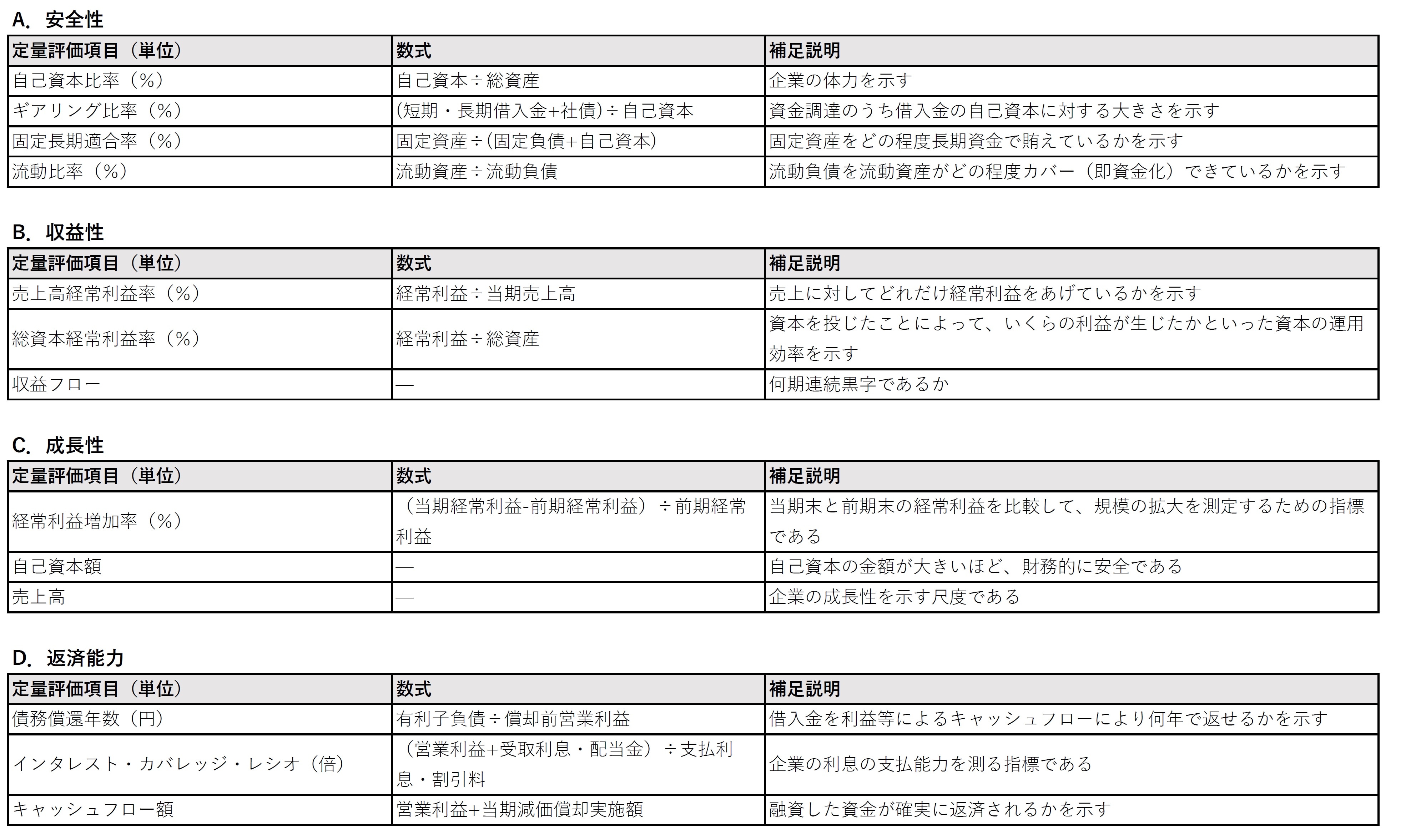 定量評価とは、資本金や自己資本比率などの財務指数を評価に換算するものです。以下のような項目があり、金融機関によって、独自の配点基準があります。