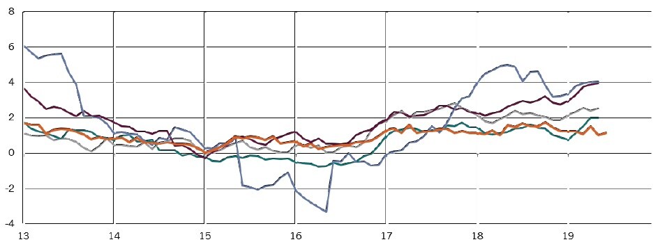 ※緑線:ポーランド、灰色:チェコ、濃い赤線:ハンガリー、青線:ルーマニア、薄い赤線:ユーロ圏、時点:ユーロ圏は2019年5月、その他は2019年6月