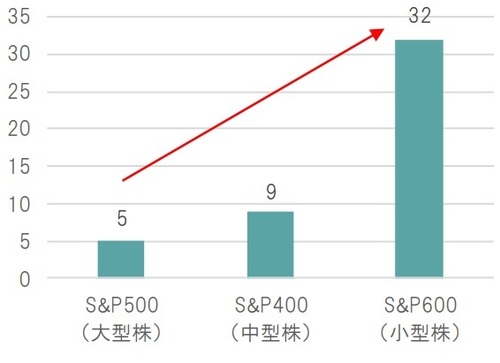 米国の主要な株価指数であるS&P500( 大型株) 、S&P400(中型株)、S&P600(小型株)の3つの株価指数の構成銘柄を対象にゾンビ企業を抽出した(図表1)。結果は大型株では5銘柄のみだったが、中型株では9銘柄、小型株では32銘柄へ増加した。やはり規模の小さい企業ほどゾンビ企業になる傾向がある。