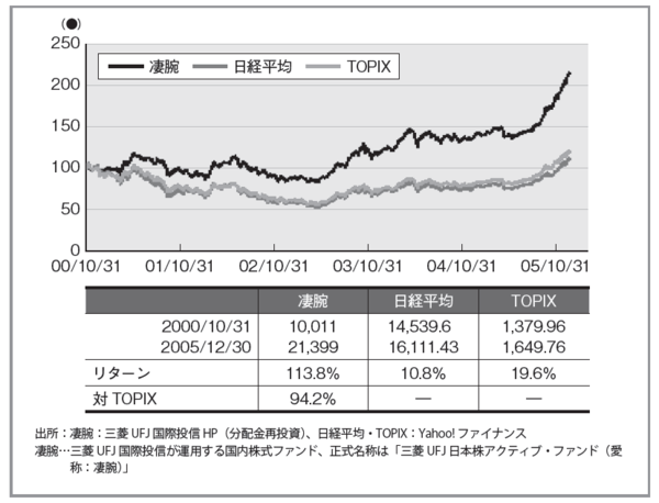 2000年から2003年までに相場はマイナス50%ほど大きく下落します。その後上昇し2005年にようやく2000年時の株価に戻すことになりますが、2000年の設定時からの運用パフォーマンスの比較を見てみると、2000年10月末(凄腕の設定日)〜2005年末までの累積リターンが、日経平均は10.81%、TOPIXは19.6%でした。