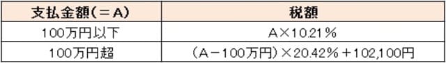 支払総額が100万円までであれば、10.21%を乗じて計算します。100万円を超えた場合、その超える部分の金額については、20.42%を乗じて計算するだけなので、計算自体は簡単ですね。