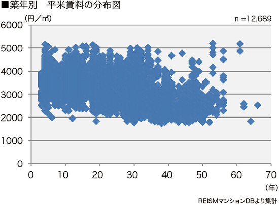 錦糸町駅の賃貸市場を分析していきます。まずは賃料相場と築年数の比較[図表2]です。23区平均と比較すると、賃料相場は23区の3,339円/㎡に対し、錦糸町は3,441円/㎡。錦糸町エリアは副都心エリアにも指定されている繁華街ですが賃料相場そこまで高くはありません。また、「築年別 平米単価の分布」[図表2]を見ると20~30年の物件でも築年による賃料下落の影響が小さなエリアであることがわかります。