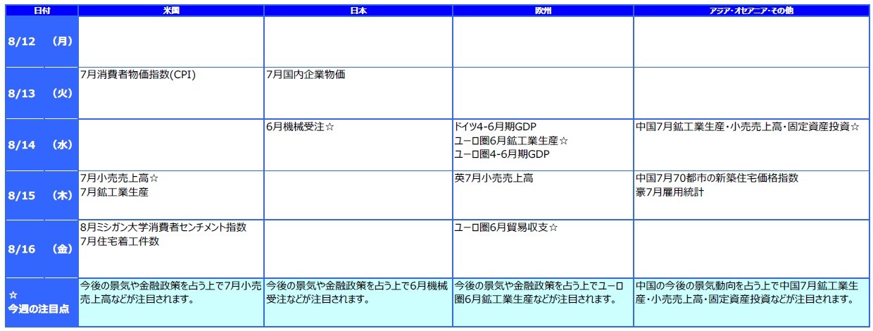 三井住友DSアセットマネジメント株式会社が、2019年8月5日~8月9日のマーケットについて振り返り、「1. 先週の市場動向、2. 先週のアジア・オセアニア株式・リート市場、3. 先週のマーケット・デイリー/ウィークリー、4. 今週の主な注目材料」のそれぞれについて解説します。今回は、「4. 今週の主な注目材料」を見ていきましょう。※本連載は、三井住友DSアセットマネジメント株式会社が提供するマーケットレポートを転載したものです。