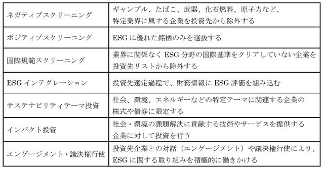 それでは、ESGは具体的に、どういった形で投資に使われているのであろうか。下記図表3は、代表的なESG投資の7つの方法である。